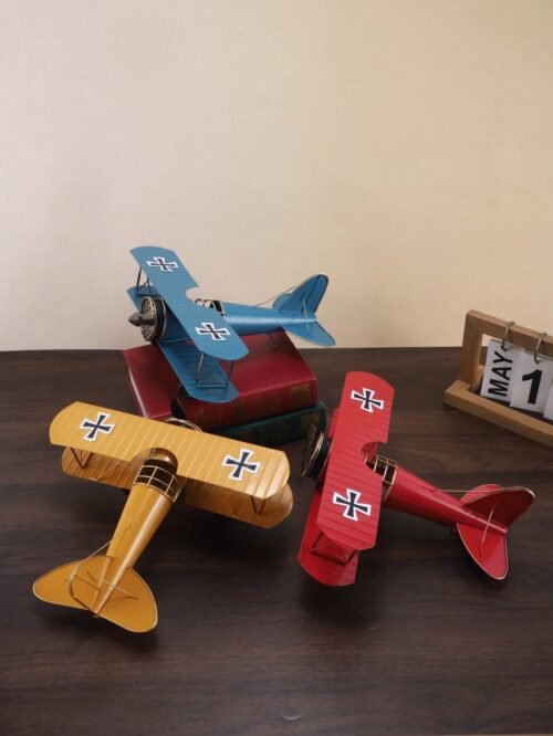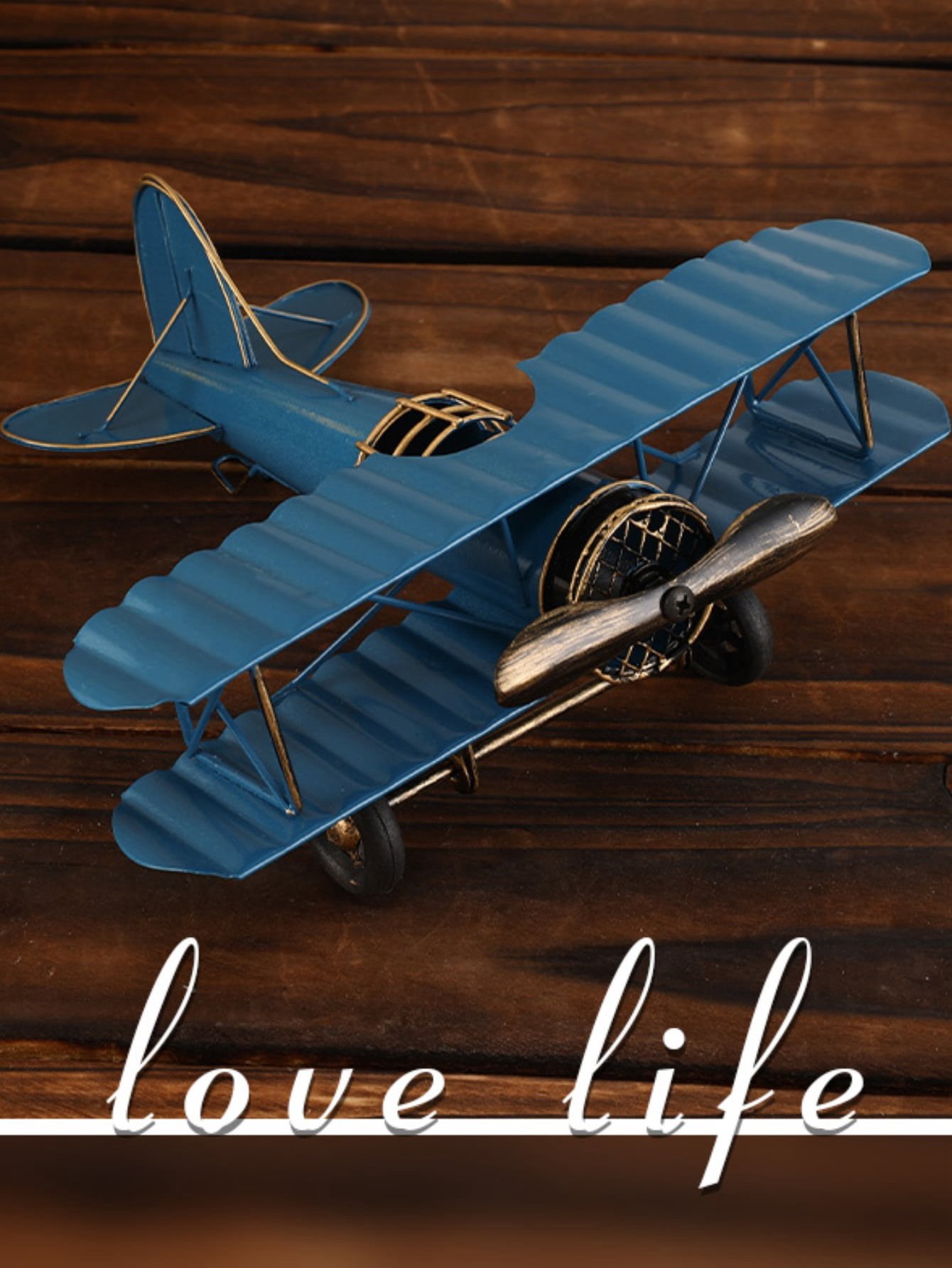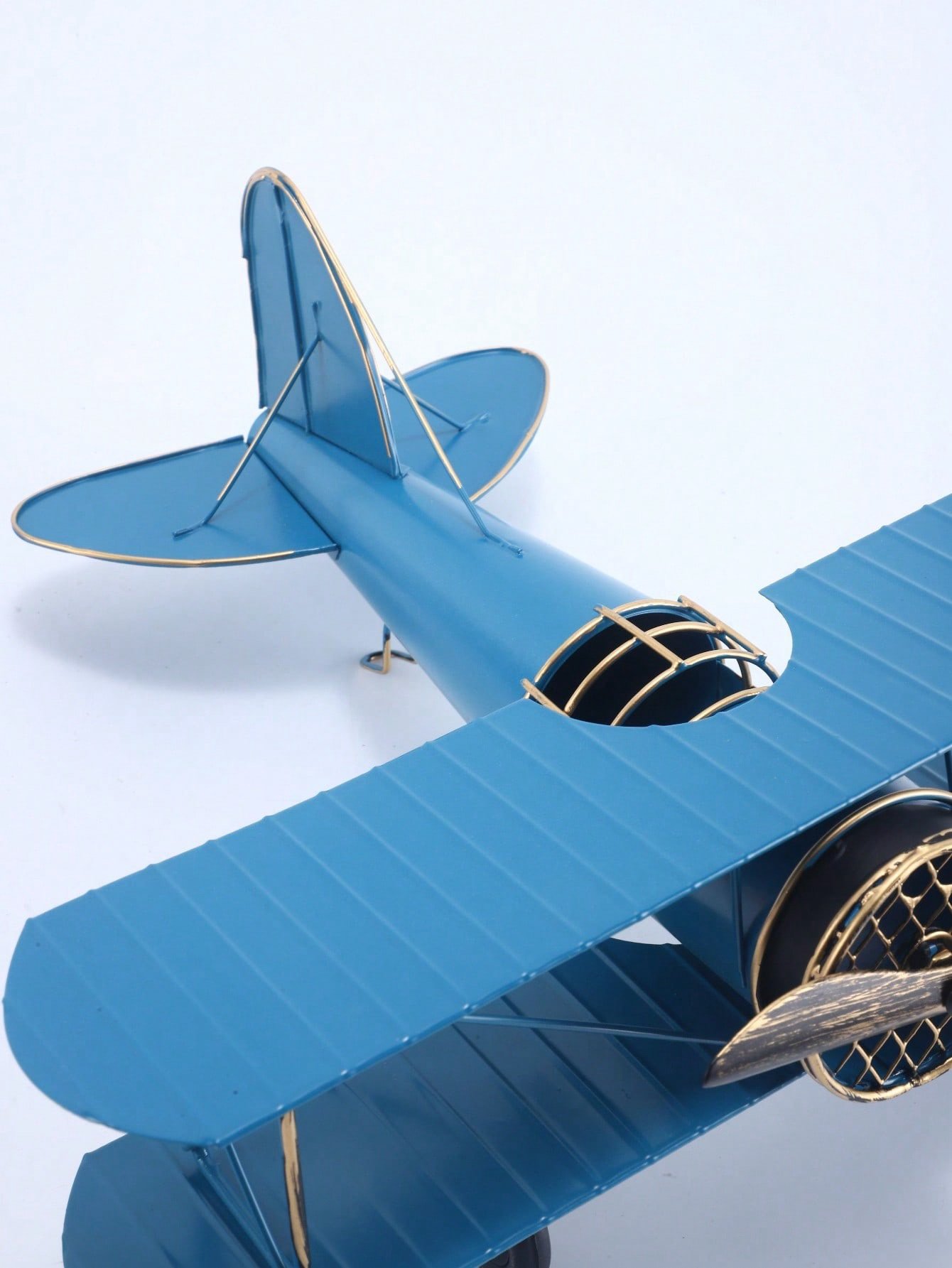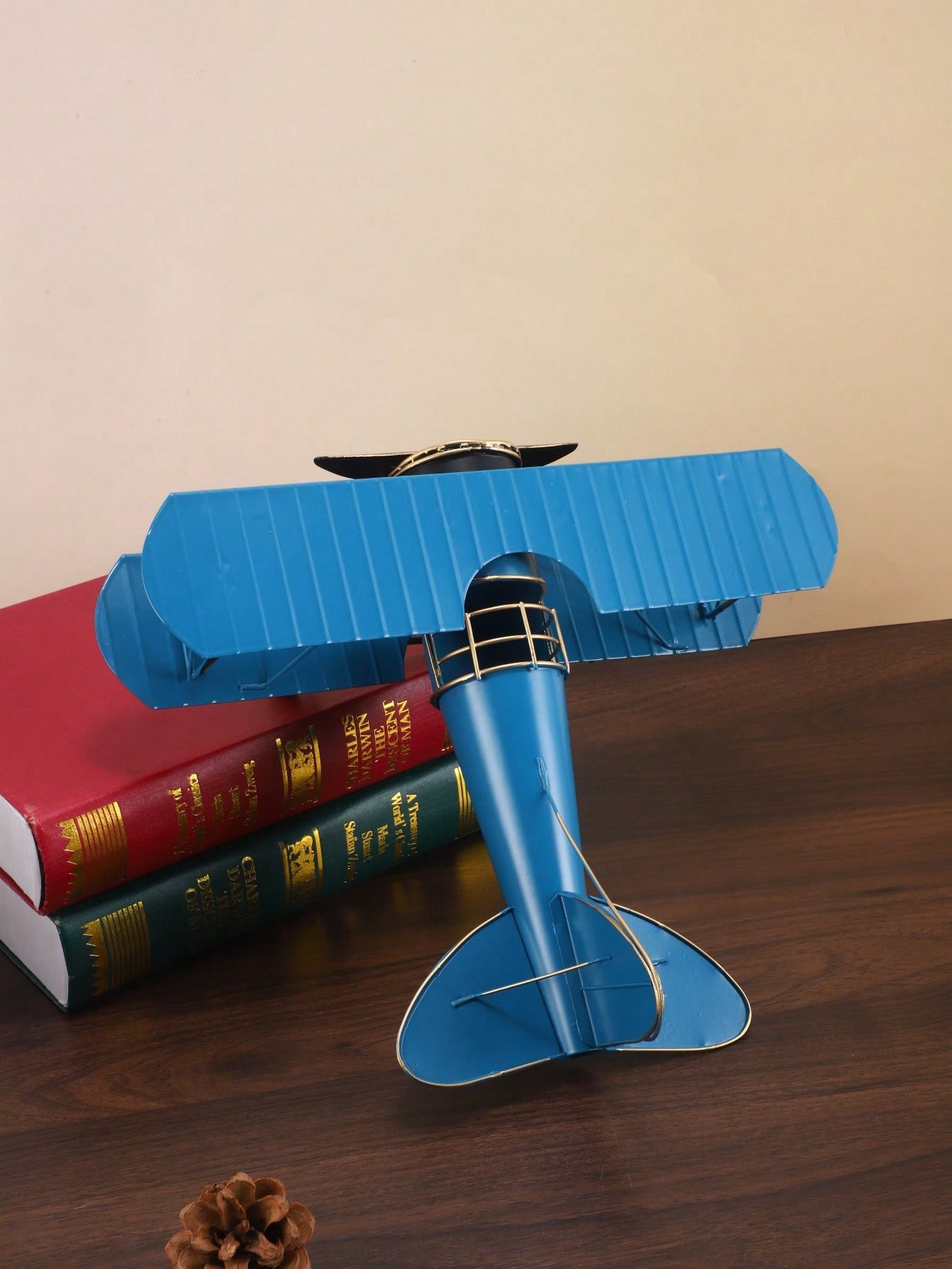 This plane is Vintage Biplane Model, Metal Aeroplane Bookshelf Ornament, Nostalgic-Style Desktop Display, Unique Gift For Aviation Enthusiasts.